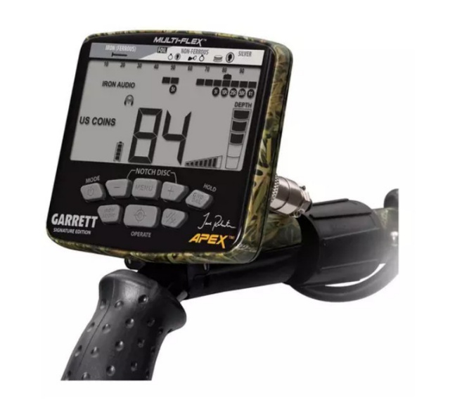 Enjoy treasure hunting while showing your love for wildlife hunting with the Garrett ACE Apex Jase Robertson Camo Edition Metal Detector. This metal detector comes in a camo pattern and offers built-in wireless operation using Z-Lynk™ technology. Hi-resolution ground balance, 6 detection modes and flexible frequency options help you customize your treasure hunt to be effective on a variety of terrain.